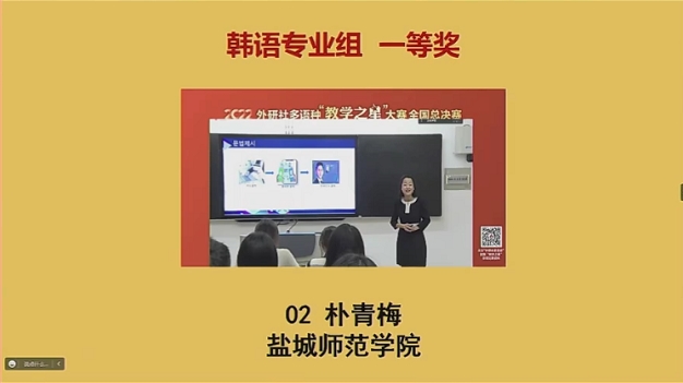 2022年12月17日8:20-12:20,由北京外国语大学中国外语与教育研究中心、北京外国语大学中国外语教材研究中心、外语教学与研究出版社主办的多语种“教学之星”大赛韩语专业组全国总决赛成功落下帷幕,我系朝鲜语专业教师朴青梅获韩语专业组全国总决赛一等奖,朴丽花获二等奖。