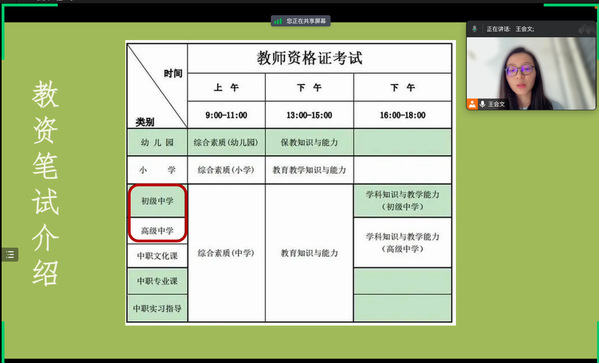首先,于胜博强调了教团队格证备考的重要性,并对教资备考的目标、方法、心态等方面提出建议。李箭教授指导的南京师范大学的学科英语研究生王会文及公司21(2)班钱佳作为往年教资高分通过者,分享了切实可行的备考经验。张军广博士、刘岩博士、杨丹博士均从教师视角提出备考建议,提醒同学们在备考中需不断培养系统思维、概念思维、答题思维。
